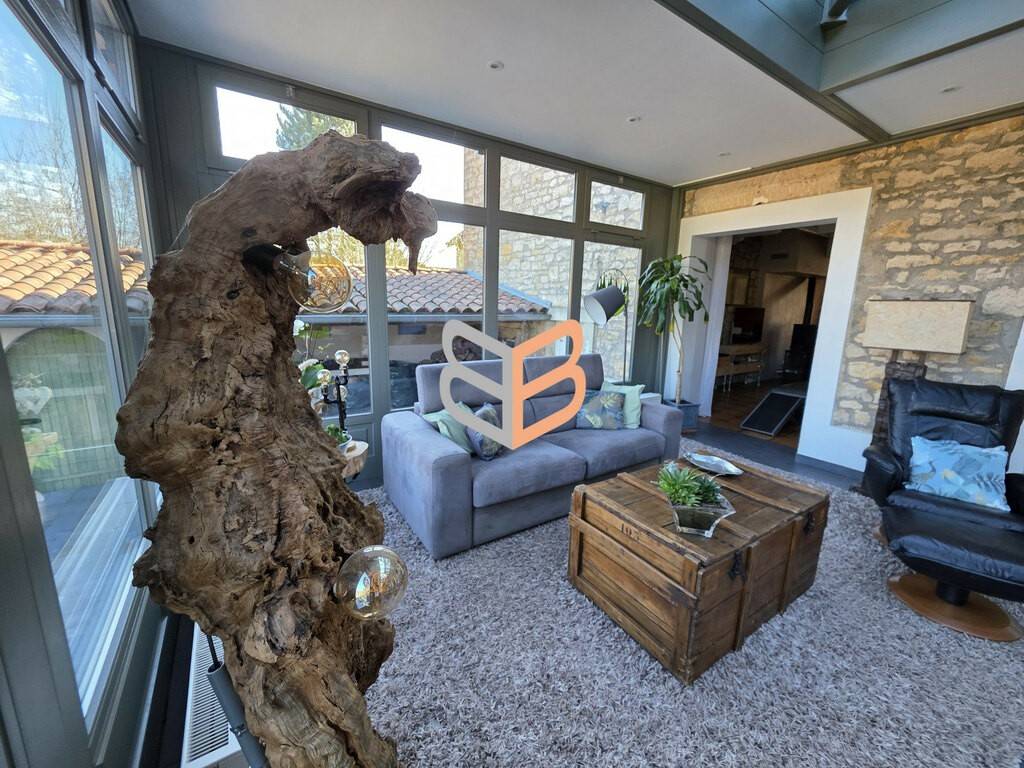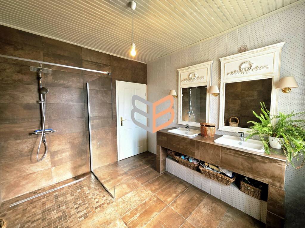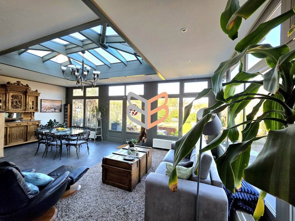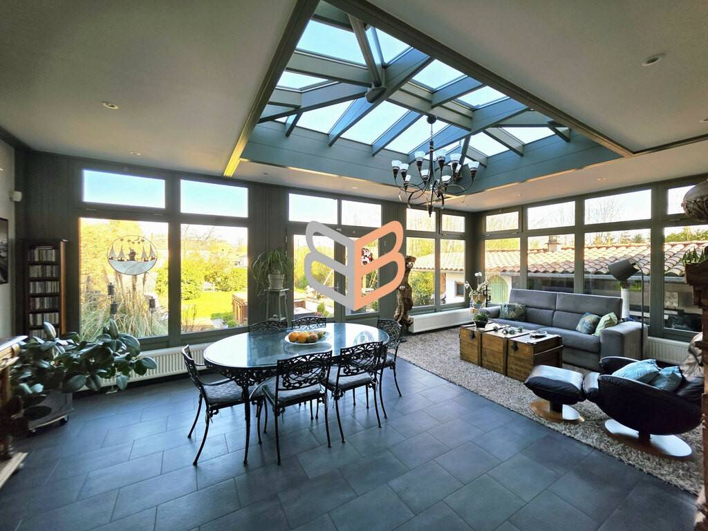 La maison dispose également d’une cuisine équipée de 14 m² au style authentique, ainsi que d’une magnifique véranda de 35,5 m², véritable pièce de vie supplémentaire baignée de lumière et ouverte sur le jardin.