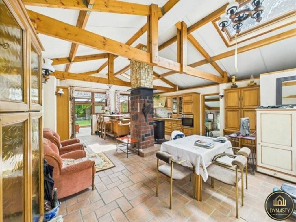 À l’intérieur, vous découvrirez une spacieuse pièce de vie regroupant le salon, la salle à manger et une cuisine équipée. L’ambiance y est chaleureuse grâce à la présence d’un poêle à bois. La véranda, accessible depuis le séjour, vous invite à profiter d’une vue imprenable sur le grand jardin arboré et verdoyant, un espace idéal pour se détendre en toute saison. Une toilette séparée est accessible depuis le séjour.