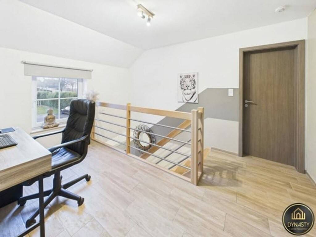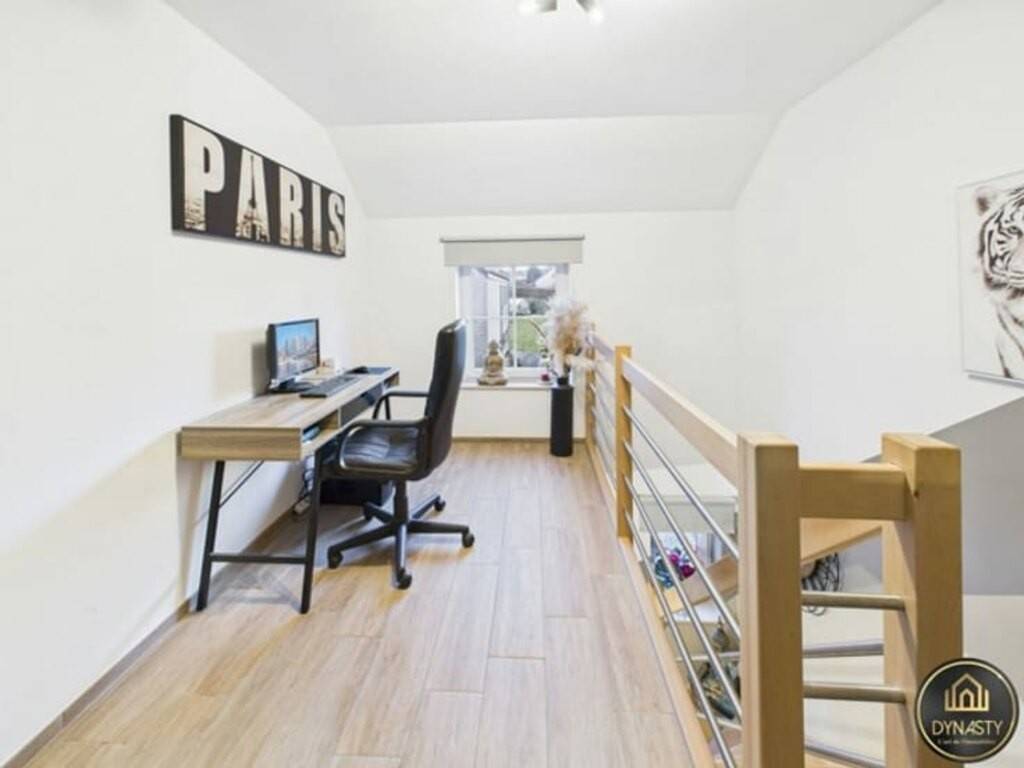 À l’étage, la maison s’organise autour d’un hall de nuit spacieux, actuellement aménagé en espace bureau, parfait pour le télétravail ou un coin lecture. Celui-ci dessert trois belles chambres ainsi qu’une salle de bain complète, équipée à la fois d’une douche, d’une baignoire et d'une toilette, offrant un confort optimal pour toute la famille.