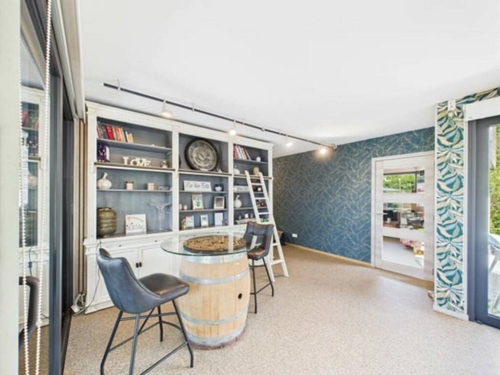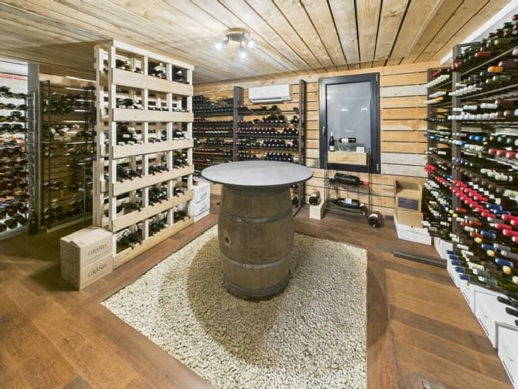 Le sous-sol aménagé offre divers espaces de rangement, une cave à vin et une pièce de dégustation.
