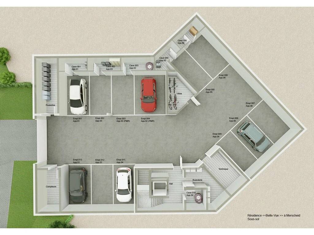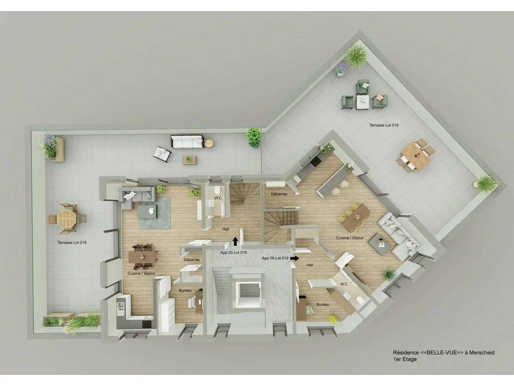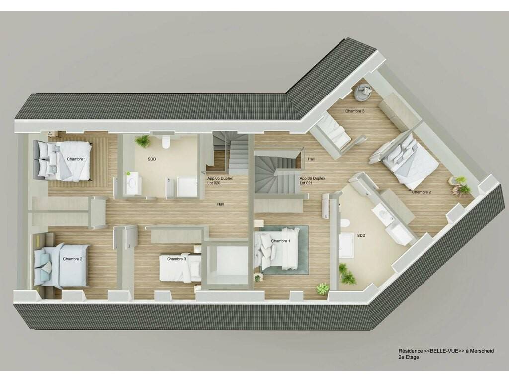 The real estate agency HOME INVEST offers you exclusively a duplex-apartment (Lots 019+021) with a living area of 156.49 sqm, located on the first and the last floor of the Residence "BELLE-VUE" in Merscheid, which is arranged as follows: