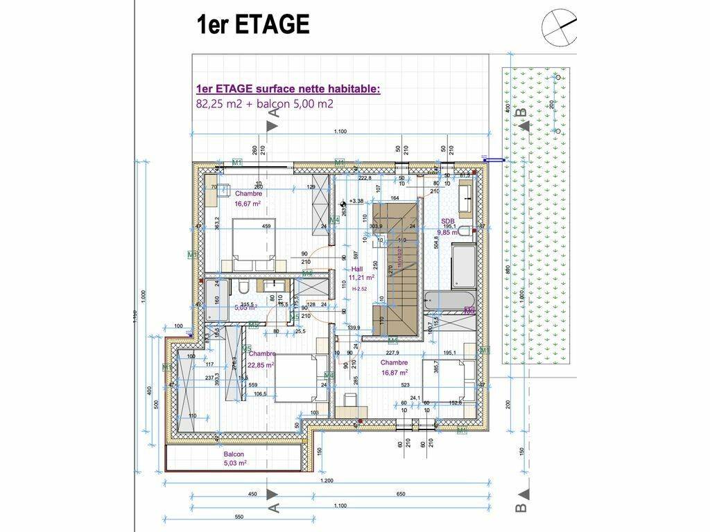 1 étage: hall de nuit, 3 chambres à coucher dont une avec balcon 5m2 et salle de bain, une deuxième salle de bain.