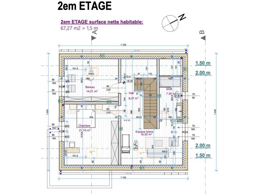 2 étage: hall de nuit, 1 grande chambre de 21,15m2, 1 bureau 14m2, 1 salle de jeux 16,50m2, 1 salle de bain.