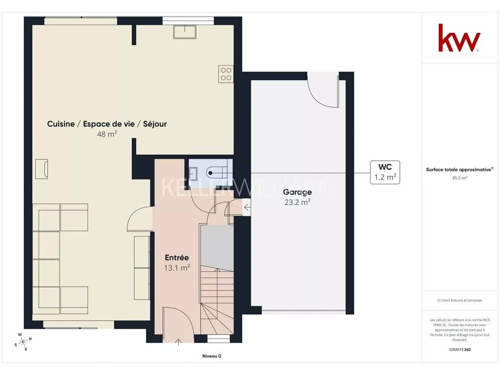 - Séjour de 50m2 avec cuisine ouverte et espace salle à manger avec accès à la terrasse,