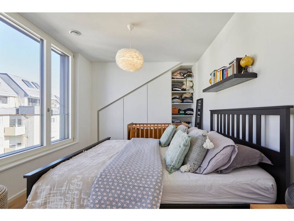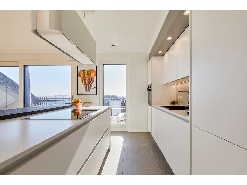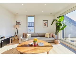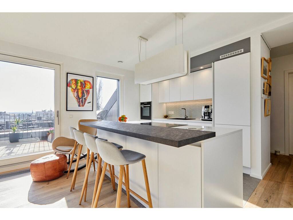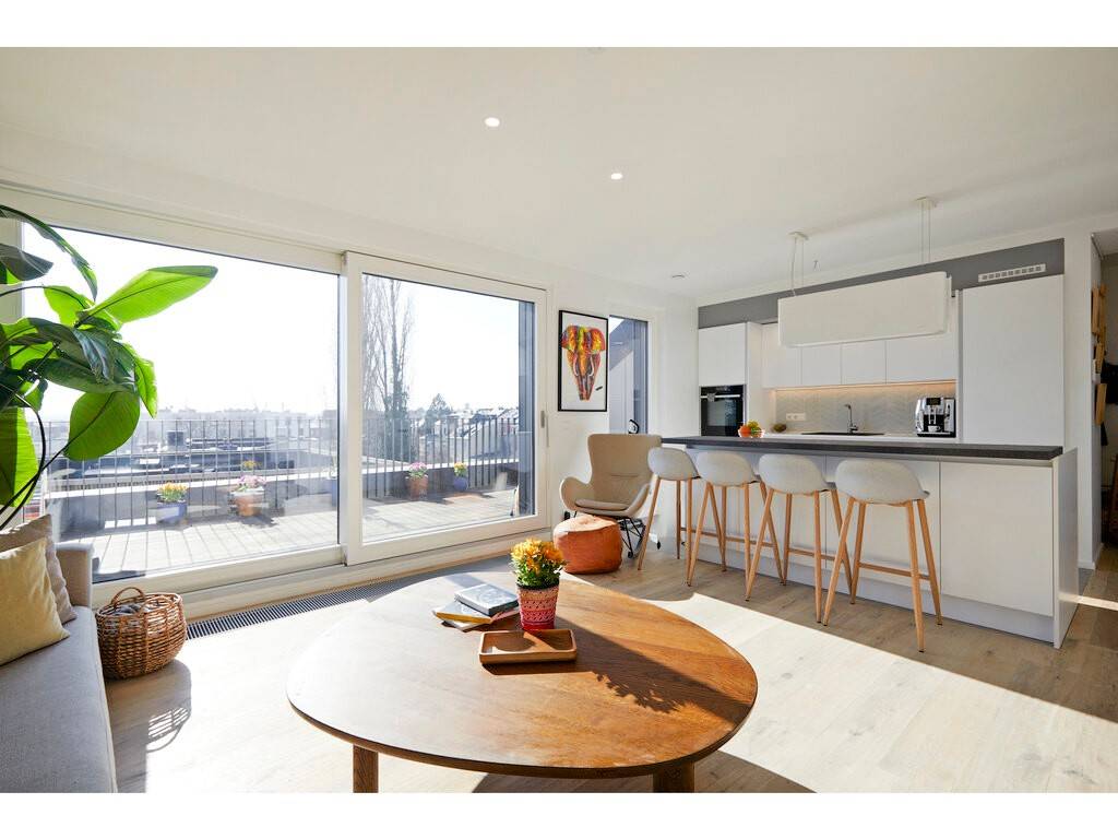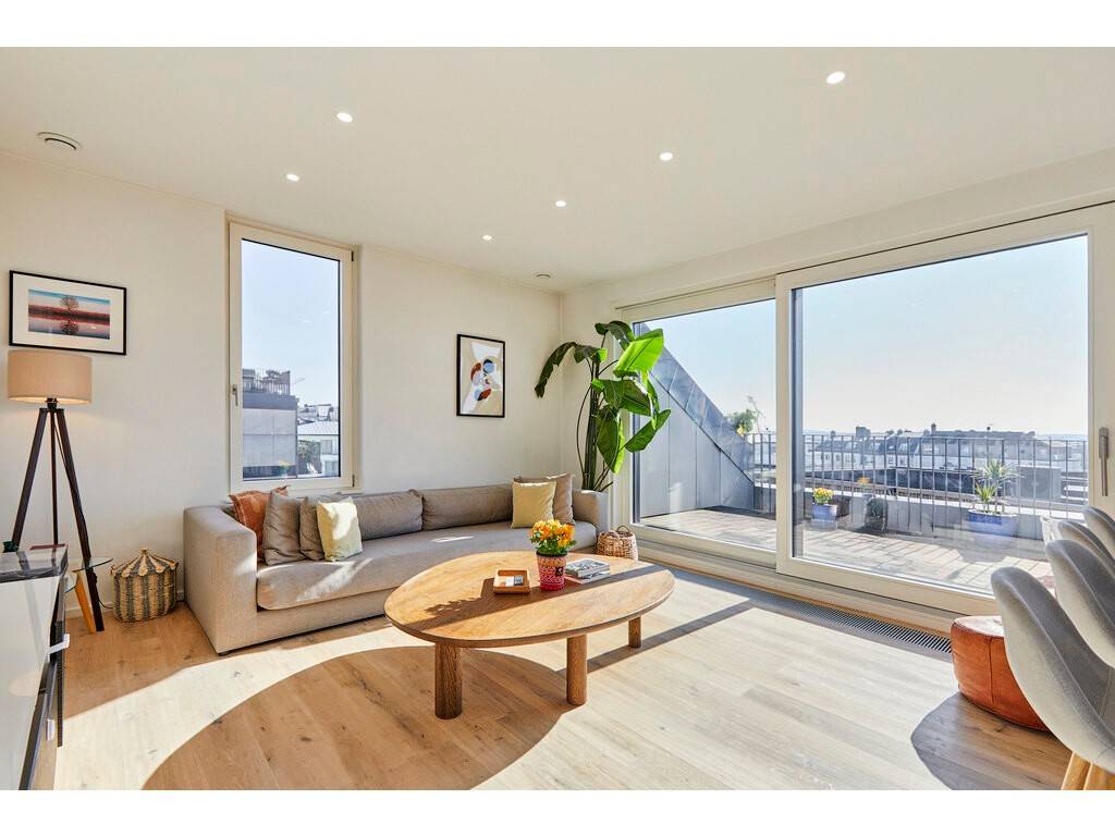 Flooded with natural light thanks to large bay windows, the living area provides access to a 16 m² Dutch-style terrace facing south-east.