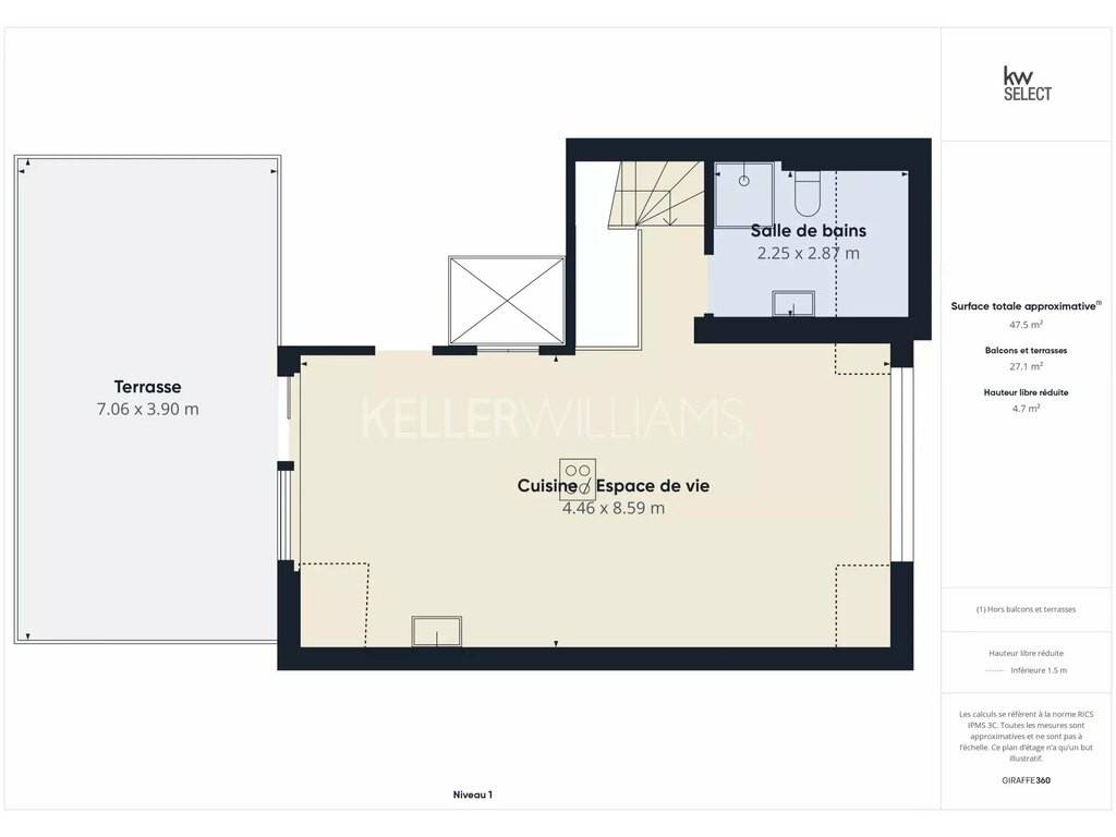 - Au 2ᵉ étage : le hall, desservant la cuisine et la pièce à vivre. Terrasse adjacente de 24,90 m² ce qui apporte énormément de charme et de lumière à la pièce. Une salle de bain. Accessible aussi par escalier et ascenseur.