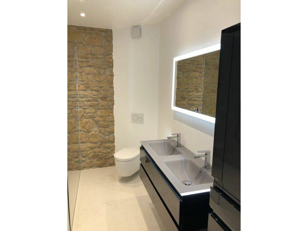 This high-end apartment boasts top-of-the-range amenities such as Carrara marble flooring, exposed stone walls, air conditioning, an alarm system, underfloor heating, electric shutters, fiber optic internet with TV in every room, and a cellar.