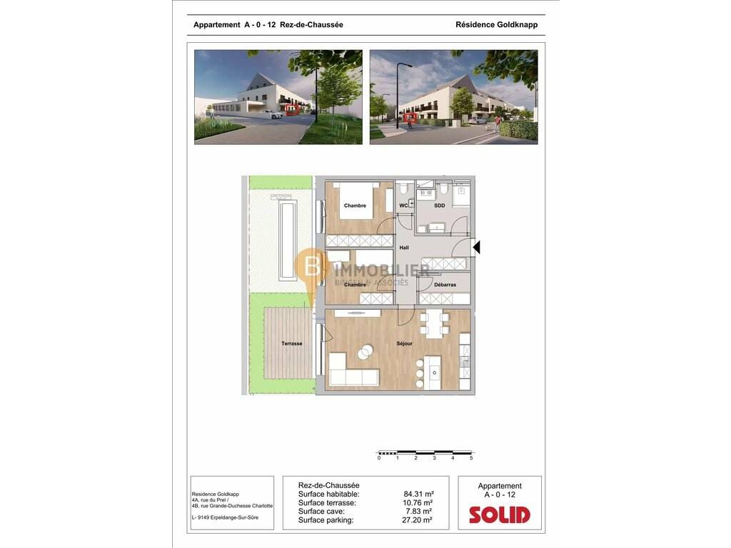 Surface habitable: 84.31 m² Surface terrasse: 10.76 m² Surface cave: 7.83 m² Surface parking: 27.20 m²