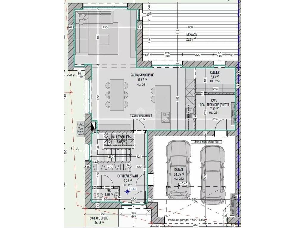 Rez-de-chaussée : hall d'entrée, toilettes séparées, salon baigné de lumière avec cuisine ouverte, buanderie, débarras, terrasse spacieuse ainsi qu'un double garage spacieux.