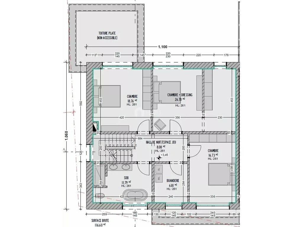 1er étage : hall, 3 chambres à coucher, dont une chambre de maître avec dressing, une élégante salle de bains et une buanderie pratique.