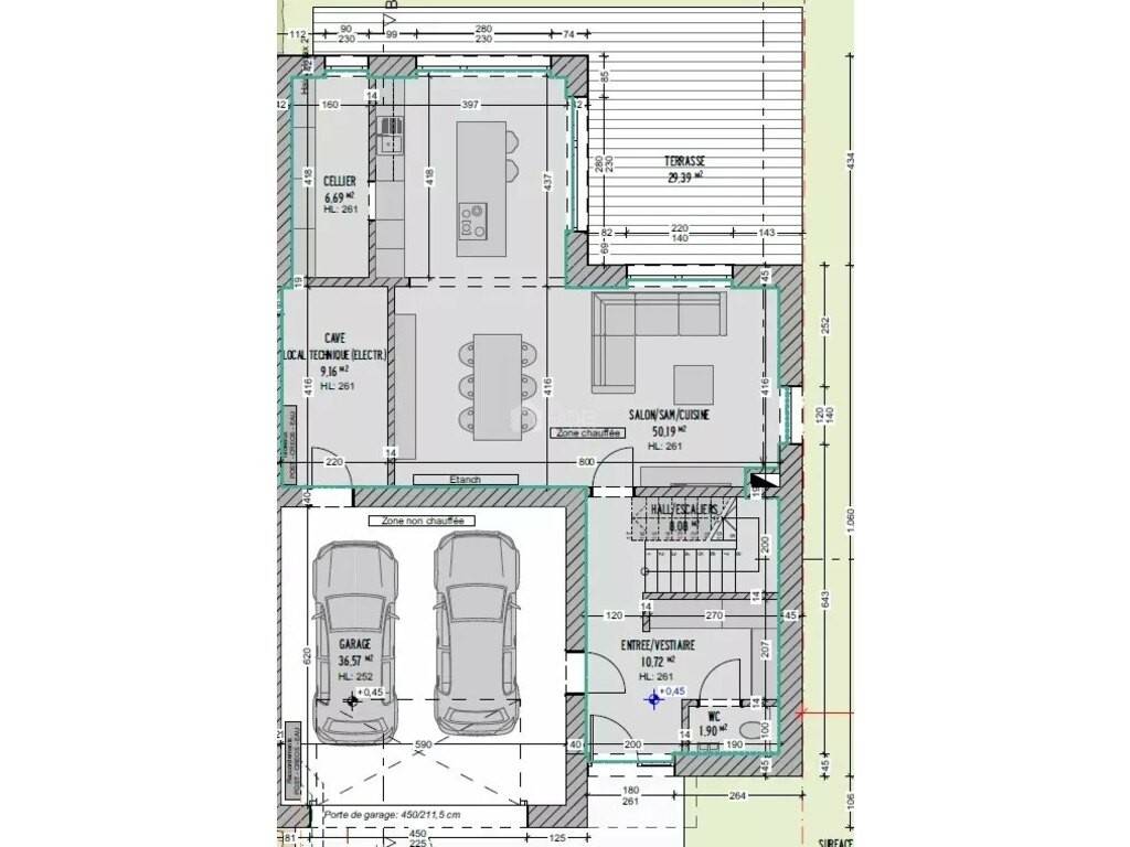 Rez-de-chaussée : hall d'entrée, toilettes séparées, salon baigné de lumière avec cuisine ouverte, buanderie, débarras, terrasse spacieuse ainsi qu'un double garage spacieux.