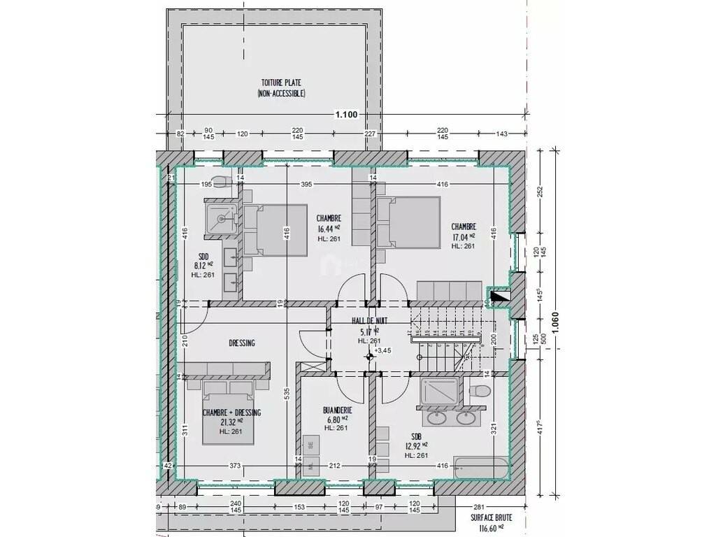 1er étage : hall, 3 chambres à coucher, dont une chambre de maître avec dressing, une élégante salle de bains et une buanderie pratique.