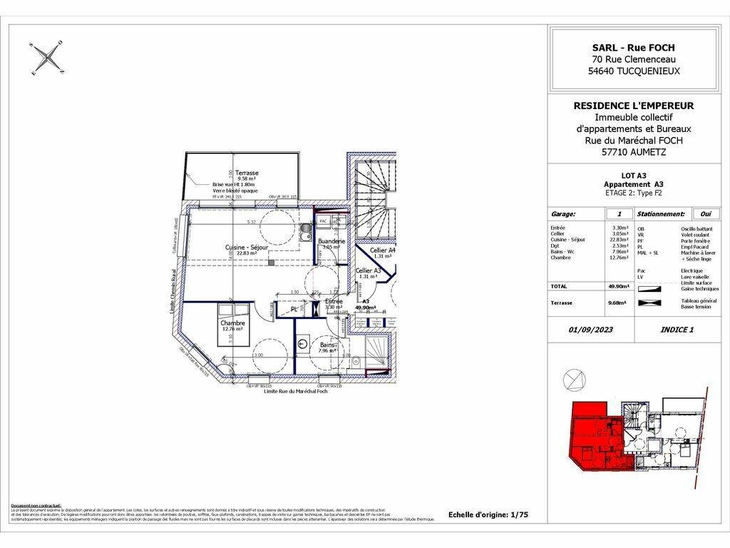 Appartement F2 (Lot A3) entièrement personnalisable de 49.90 m2 comprenant : Situé au 2ème étage avec ASCENCEUR, complètement accessible pour personnes à mobilités réduites (PMR)