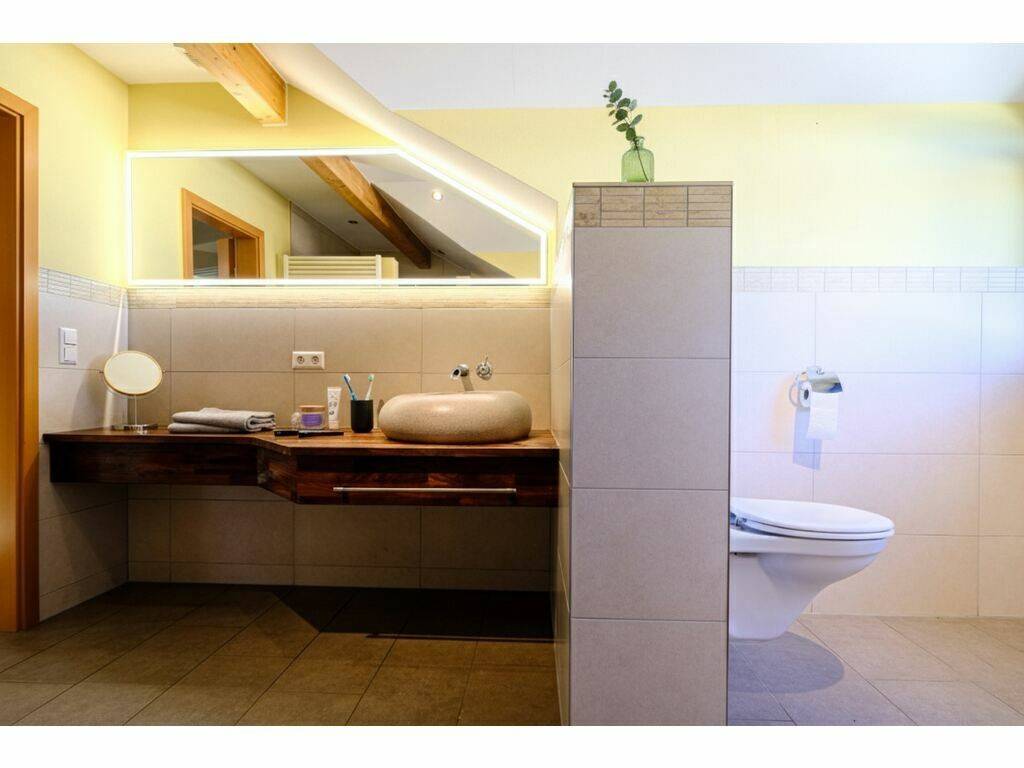 - Salle de douche avec douche italienne, lavabo en pierre, WC et fenêtre,