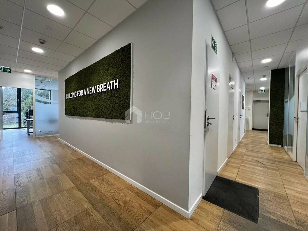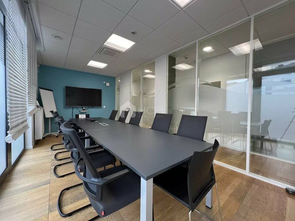 7 bureaux lumineux avec de grandes baies vitrées et une vue sur la verdure.