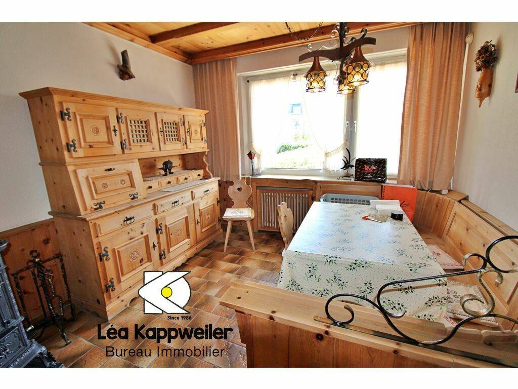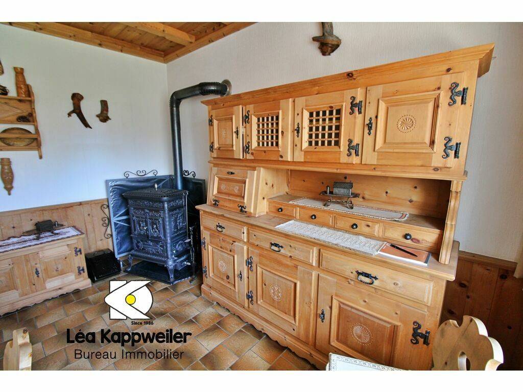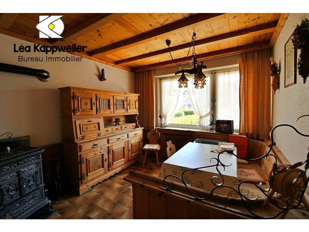 Bavarian-style custom-made living room with buffet, ceiling, dining table, corner bench and chairs, brown tiled floor, cast iron stove