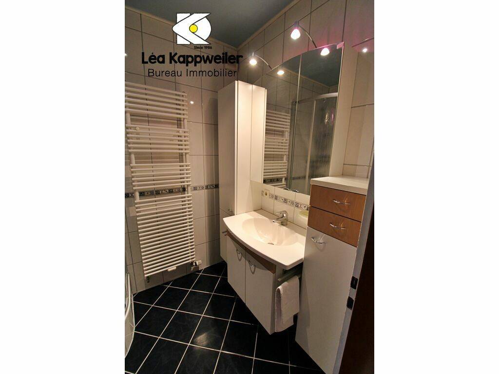 Shower room, black tiled floor, with built-in sink, furniture, and towel radiator