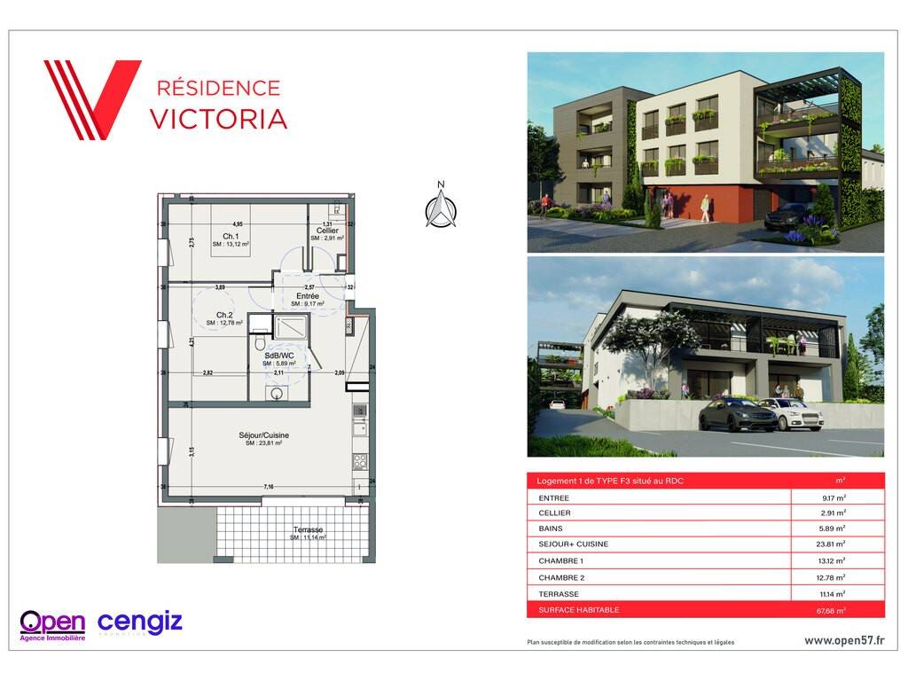 Découvrez le Lot 1 de la résidence Victoria, un appartement de 67,68 m² situé au rez-de-chaussée, avec une terrasse privative de 11,14 m², idéalement orientée pour profiter des beaux jours en toute tranquillité.