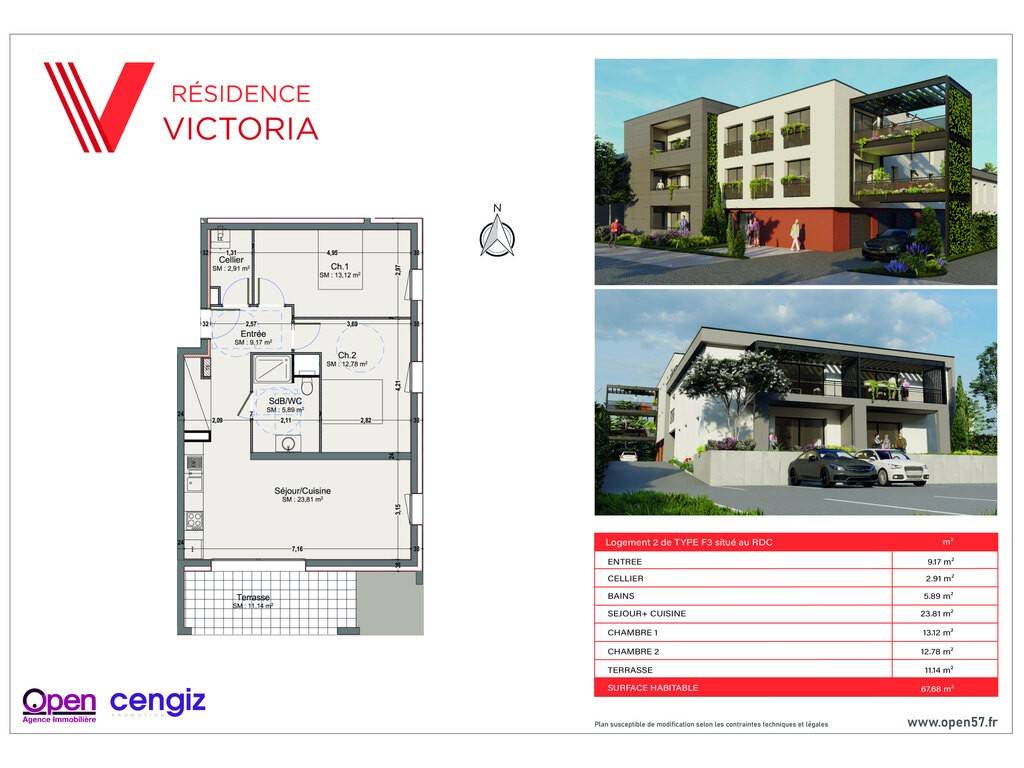 Découvrez le Lot 2 de la résidence Victoria, un appartement F3 de 67,68 m² situé au rez-de-chaussée, avec une terrasse privative de 11,14 m², idéalement orientée pour profiter des beaux jours en toute tranquillité.