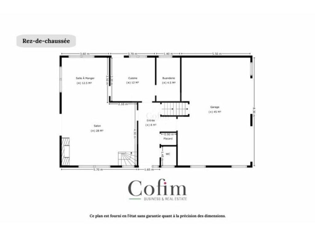 Hall d’entrée desservant un salon avec salle à manger, une cuisine équipée, une buanderie et un garage.