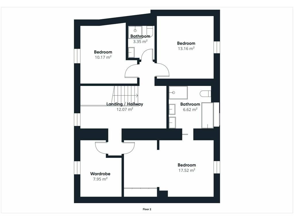 Second floor: 3 bedrooms (17.5 sqm, 13.1 sqm and 10.1 sqm) including the master suite with built-in wardrobe and its en-suite bathroom featuring a shower, a freestanding bathtub and a double-sink vanity (6.6 sqm). Children's shower room with WC (3.3 sqm), an office (8 sqm).