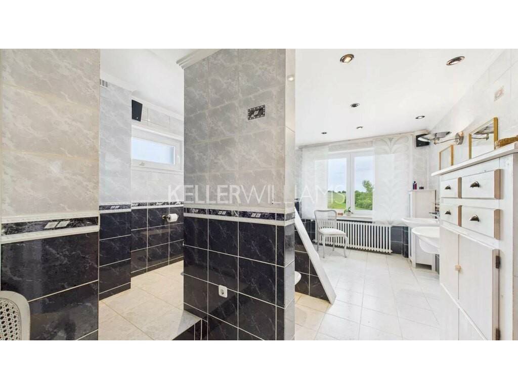 - Une grande salle de bain avec baignoire, douche, double vasque et toilettes;