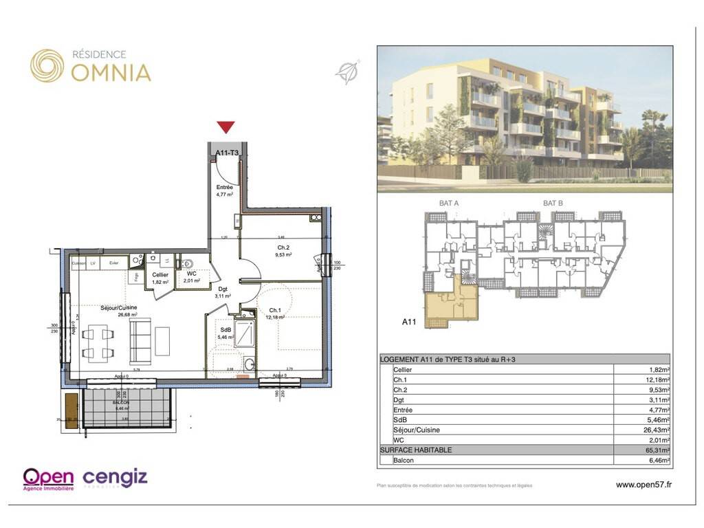 Découvrez le lot A11 de la Résidence OMNIA à THIONVILLE : un appartement de 65,31 m² de type F3 situé au r+3, avec un espace extérieur de 6,46 m² proposé au prix de 290 000,€.