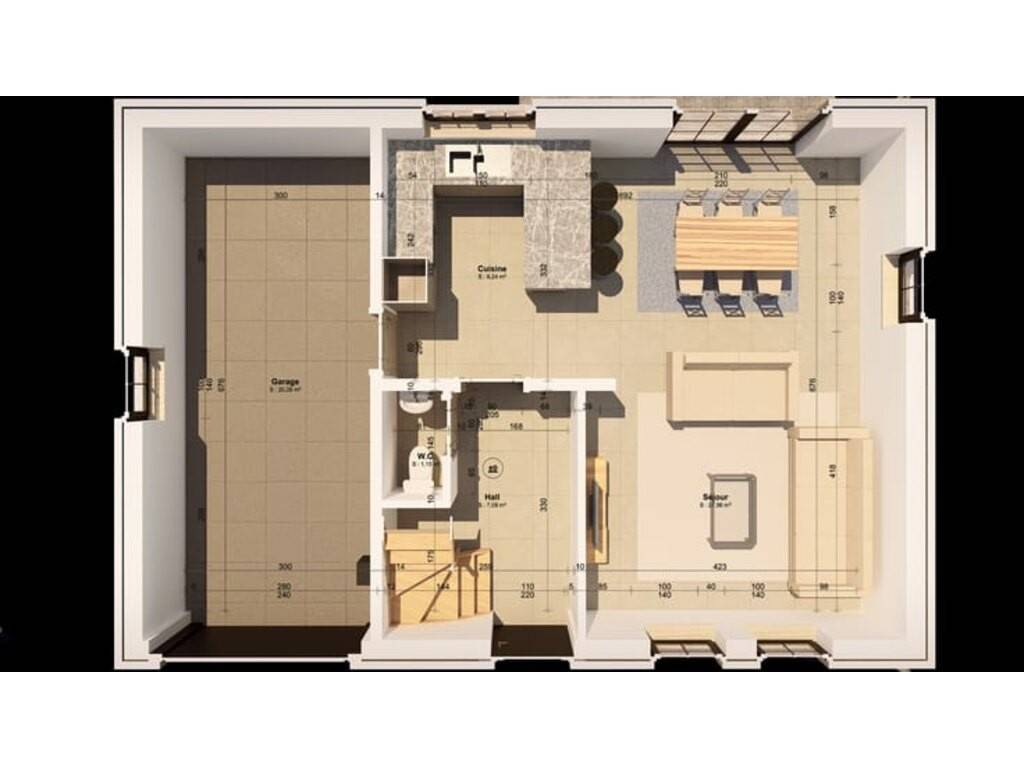 Elle se compose au rez-de-chaussée d’un hall d’entrée, d’un WC séparé, d’un lumineux et spacieux séjour avec espace cuisine ouvert et d’un garage avec coin buanderie.