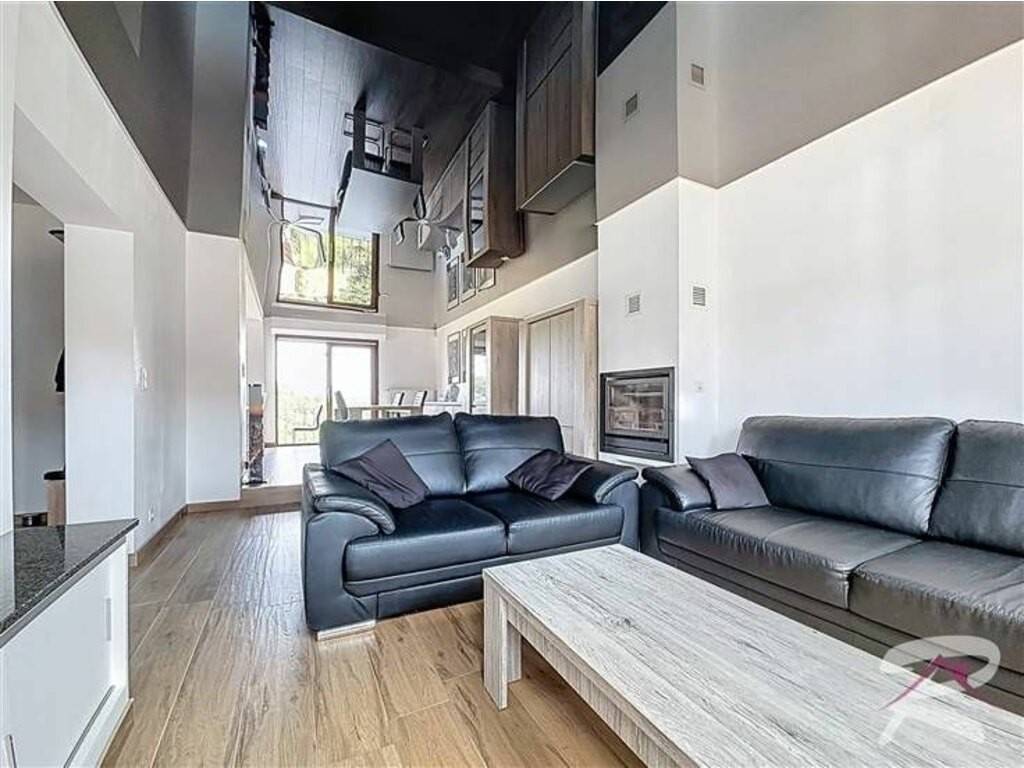 Au rez-de-chaussée : Un hall d'entrée, un WC indépendant, un séjour ouvert de 32m² doté d'une cassette à bois et avec un plafond tendu avec LED intégré en indirect, une cuisine super-équipée de 14m² donnant accès au balcon de 12m² et de sa superbe vue panoramique ;