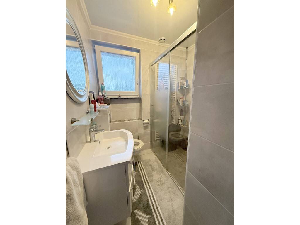 Un sas d'entrée, une entrée accueillante de 5,87 m², un vaste espace de vie lumineux parqueté de 30 m², une cuisine moderne de 10,75 m² entièrement équipée, un WC séparé avec lave-mains
