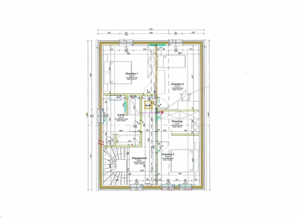 Étage : hall de nuit, 3 chambres (± 15, 13 et 12 m²), salle de bains complète (douche 120/90, baignoire, meuble vasque, WC)