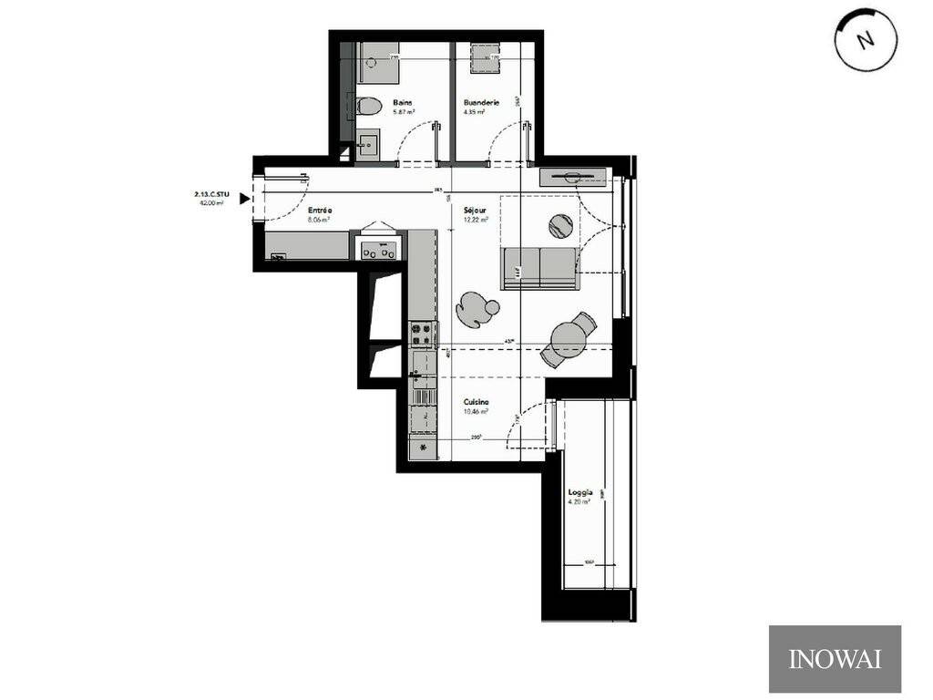 As you enter, you discover a vast open space that combines the living room and kitchen, creating a bright, friendly atmosphere.