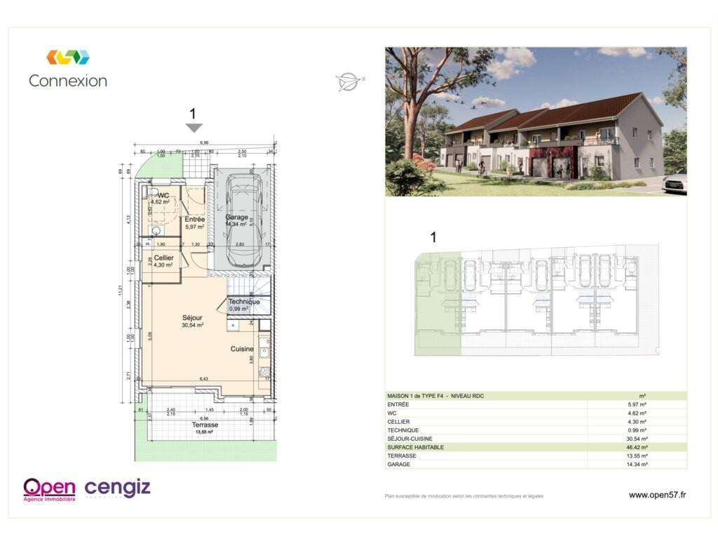 Découvrez le Lot 1 du projet résidentiel Connexion à Hettange-Grande : une maison mitoyenne d’un côté, construite de manière individuelle, proposée au prix de 400 000 €. Elle dispose d’une surface habitable de 93,73 m², complétée par un garage de 14,34 m², une terrasse de 13,55 m² avec espace vert au rez-de-chaussée, ainsi qu’un balcon de 8 m² à l’étage, offrant des extérieurs agréables et bien aménagés pour votre confort.