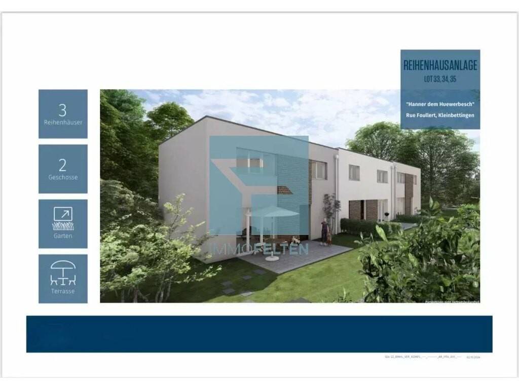 À VENDRE – Maison en bande de coin Lot 33 à coût modéré Située dans le lotissement « Hanner Dem Huerwerbesch », rue Foullert à Kleinbettigen (commune de Steinfort), cette maison mitoyenne de 121,33 m² habitables, certifiée classe énergétique A-B-A, allie confort moderne et cadre de vie agréable.