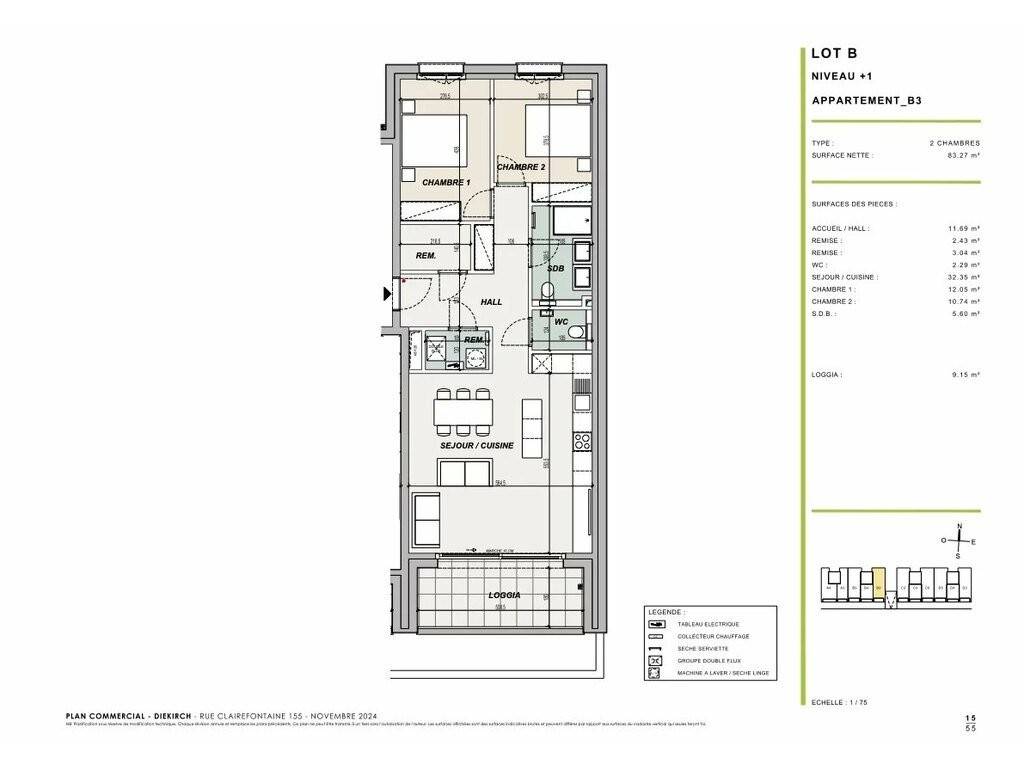 Apartment B03, 83 m², located on the 1st floor, is composed as follows: