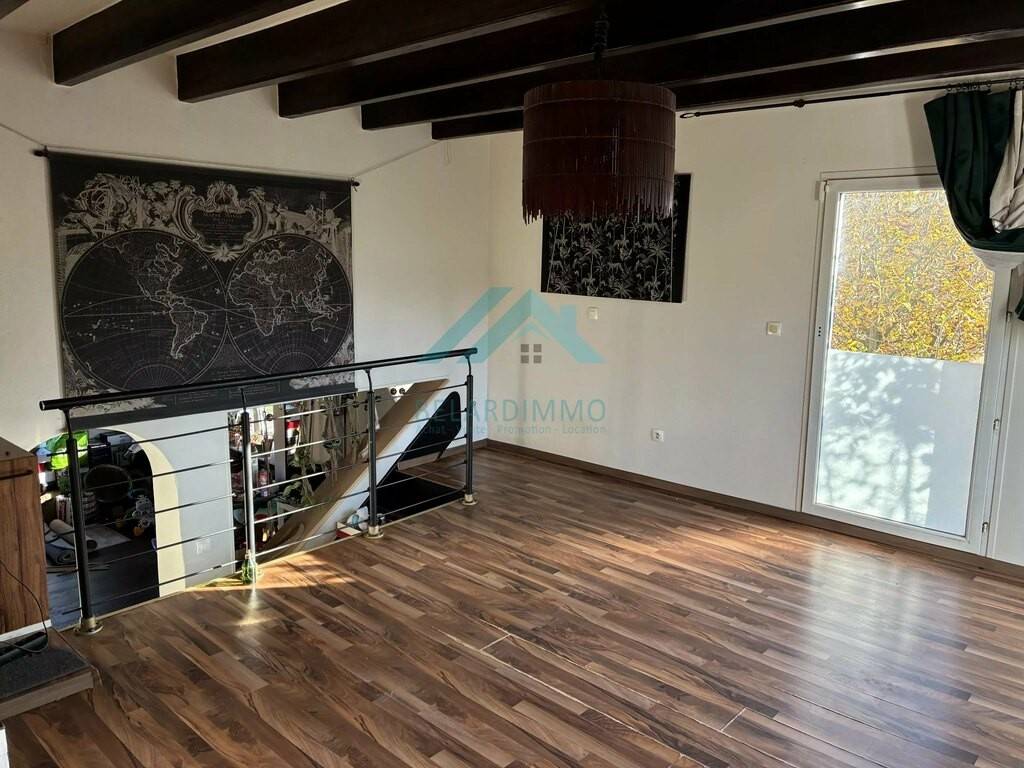 Au rez-de-chaussée : une entrée donnant sur une cuisine équipée et une salle à manger. Quelques marches permettent d’accéder au salon ainsi qu’au jardin.