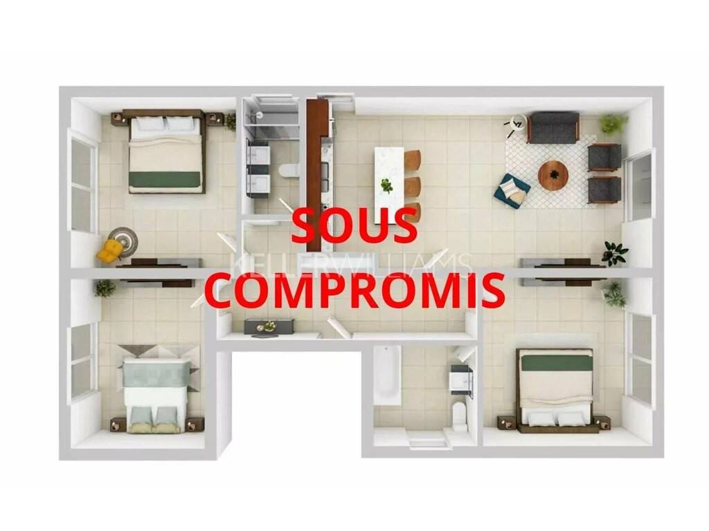 Il comprend un hall d'entrée, un salon très lumineux, une cuisine, 3 chambres à coucher, une salle de douche, une salle de bain et un débarras. L'appartement a besoin de travaux de rafraichissement.