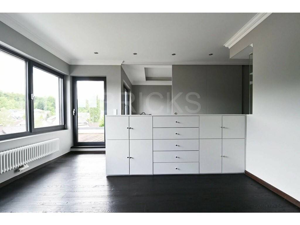 La cuisine moderne est hyper équipée et on cherchera en vain des équipements manquants. Surface de travail en granite flammé, four et micro-ondes Siemens haut de gamme, plaques over-size à induction, chauffe-plats, magnifique frigo Liebherr, multiples solutions de rangement intégré, accès direct à la loggia. Revêtements de sol en grès cérame Cronos avec spots au sol intégrés, faux plafonds avec spots design haut de gamme intégrés, joints creux.