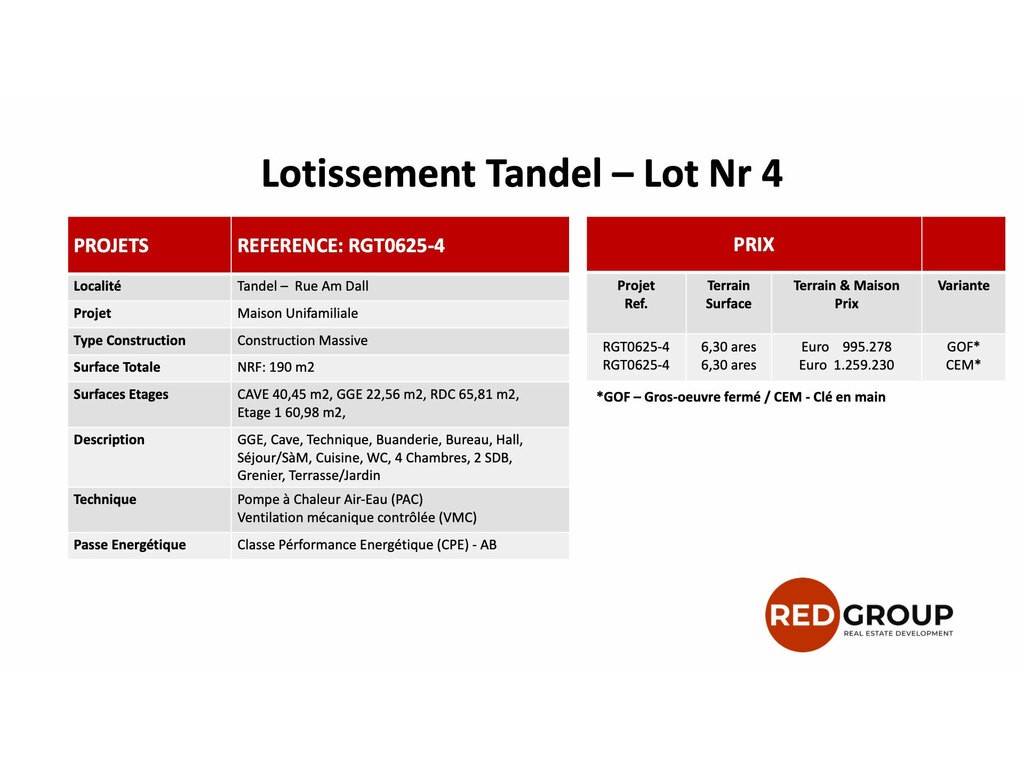 Variante Gros Oeuvre fermé: Prix Euros 995.278 Variante Clé en Main: Euros 1.259.230