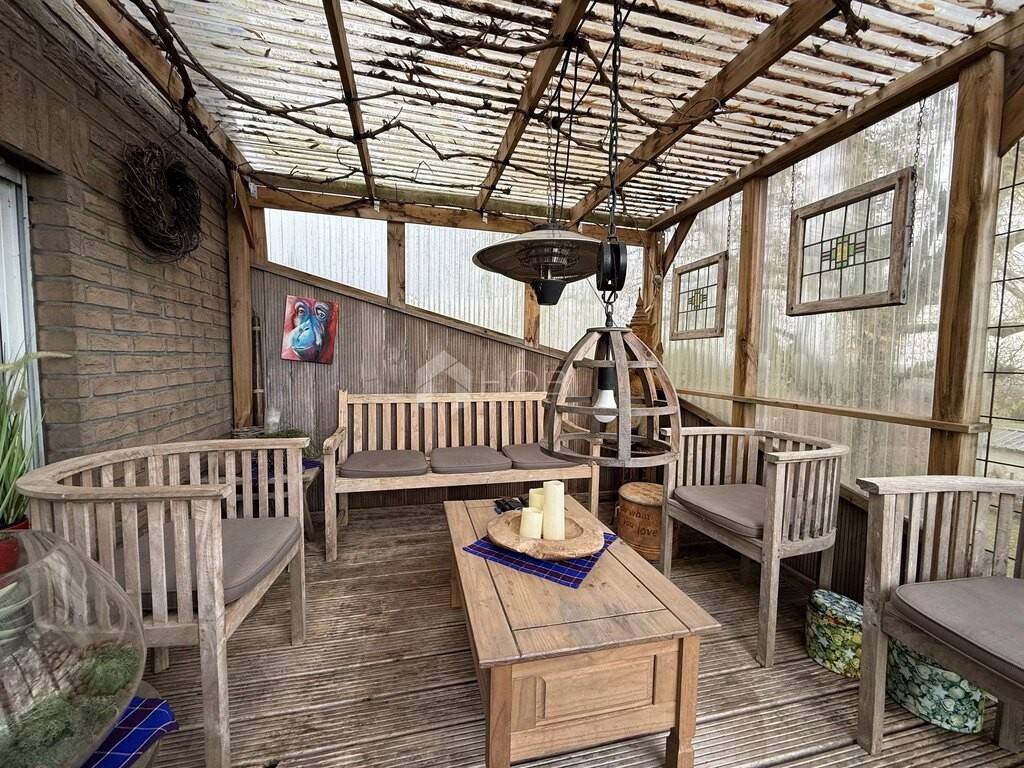 Entrée accueillante avec accès direct au salon. Salon spacieux et lumineux. Cuisine ouverte entièrement équipée, harmonieusement intégrée au salon. Cheminée confortable pour une atmosphère chaleureuse. Accès direct à la grande véranda et au jardin aménagé avec soin. Salle de bains moderne avec douche. Une chambre.