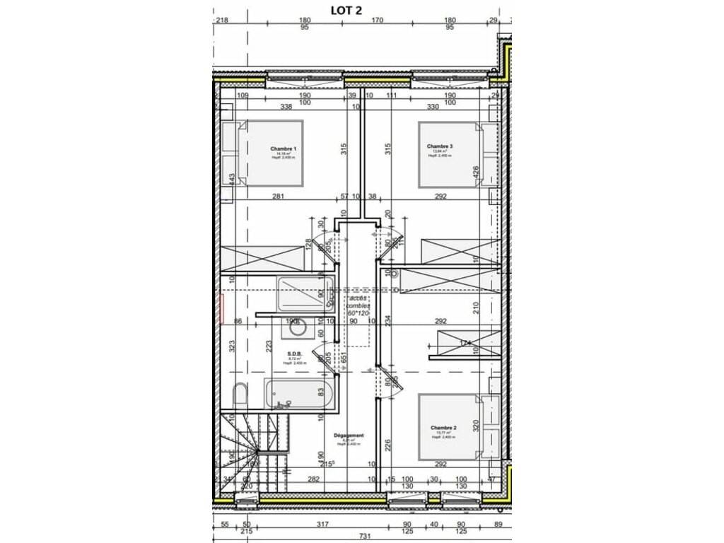 À l’étage, le hall de nuit dessert 3 chambres de +/- 16 m², 14 m² et 13,5 m² ainsi qu’une salle de bain de +/- 8,5 m². De plus, un grenier de +/- 30 m² est accessible via un escalier escamotable.