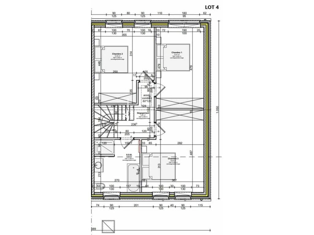 À l’étage, le hall de nuit dessert 3 chambres de +/- 16,5 m², 14,5 m² et 13,5 m² ainsi qu’une salle de bain de +/- 8,5 m². De plus, un grenier de +/- 30 m² est accessible via un escalier escamotable.