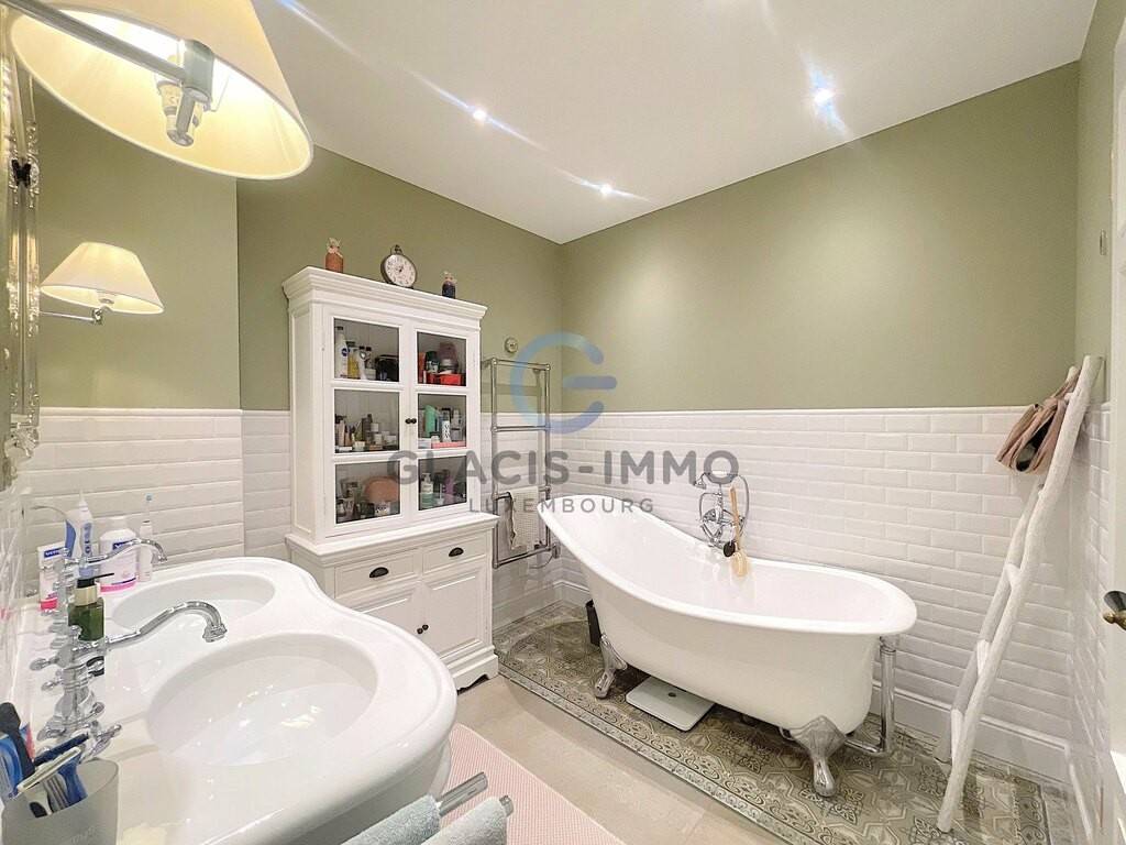 - d’une salle de bain complète au design très authentique avec double vasque, baignoire et grande douche sur mesure, mêlant carrelage métro, carreaux anciens et niche en béton brut,