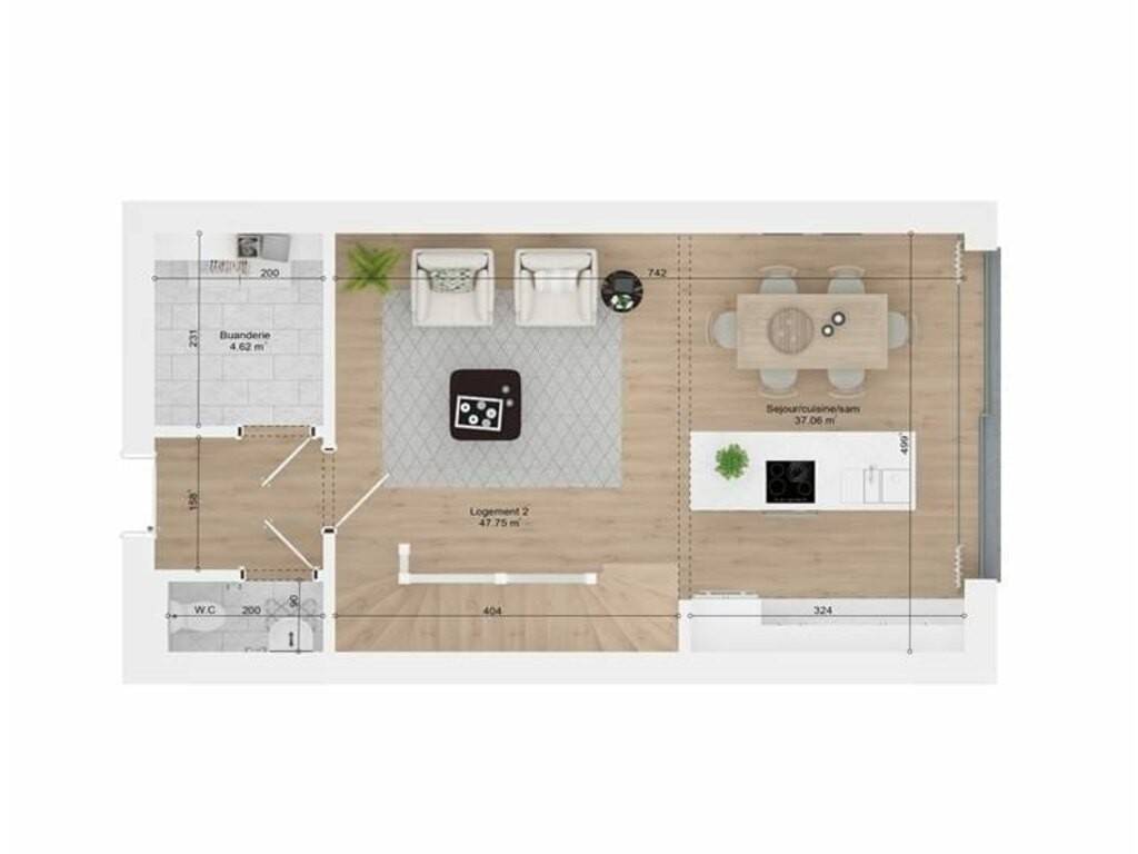 Cet appartement, avec entrée séparée, offre un hall d'entrée avec WC séparé, un séjour lumineux avec cuisine ouverte de 47m² et une buanderie. À l'étage, deux chambres spacieuses (15 et 18m²), une salle de bain. Ce bien bénéficie également dune terrasse orientée sud-est et d'un jardin privatif. Emplacements de parking extérieurs en supplément.