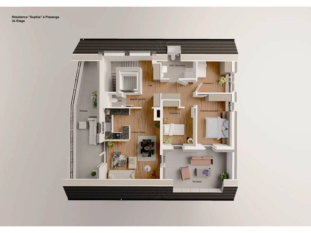 L’agence IMMOBILIERE MARECHAL vous propose en exclusivité un appartement, (lot 009) d’une surface habitable de 68,02 m2, situé au 1ier étage de la Résidence « SOPHIA » à Pissange, qui se présente comme suit :