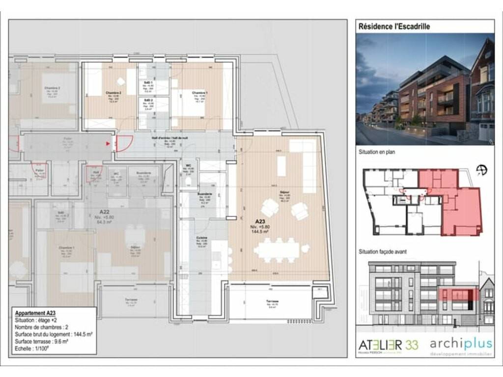 Appartement deux chambres (A23) de 145m², situé au deuxième étage et composé d’un très grand séjour traversant de 48m² et d'une cuisine équipée de 16m² au choix de l'acquéreur, d’un hall d’entrée, d’une buanderie, de deux salles de bains (ou douches), d'un wc séparé et d’une terrasse couverte de 10m².