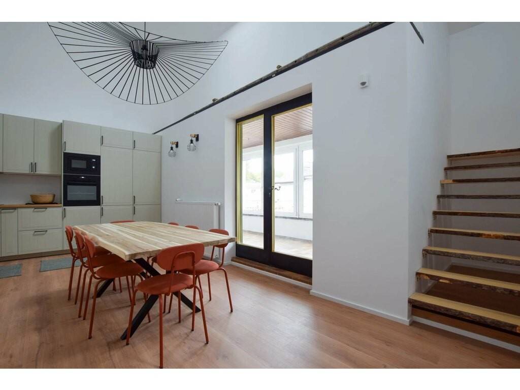 Les espaces communs suivants sont prévus: * une grande cuisine entièrement équipée avec hauteur sous plafond de 4m, donnant également sur une véranda, et avec quelques marches menant au coin salon * deux grandes salles de douches, avec doubles vasques et wc * un wc séparé supplémentaire * une buanderie équipée avec lave-linge et singe linge * espace de rangement dans la cave si nécessaire * possibilité de stationnement privatif si nécessaire