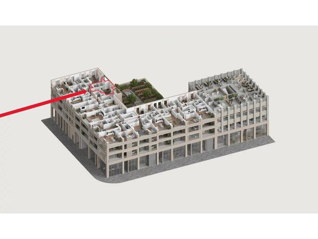 The AAA energy class building will be equipped with high-performance frames and glazing, a new generation solar panel roof, an urban farm, and a rainwater recycling system.