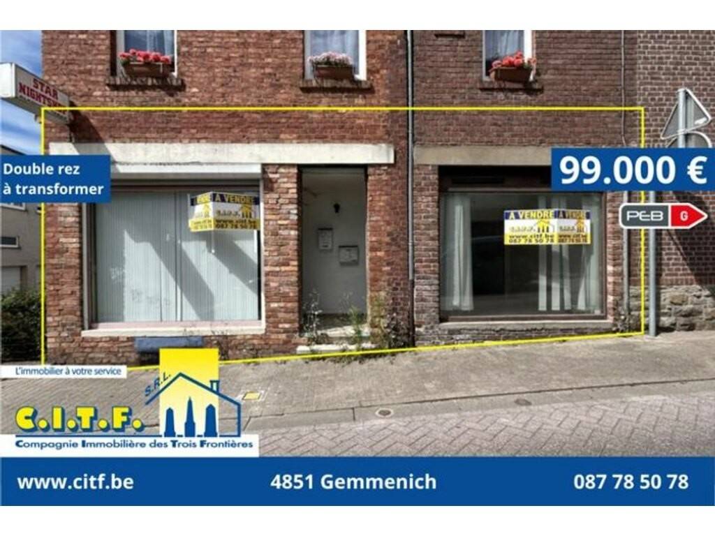 Ensemble immobilier : intéressant double rez-de-chaussée à transformer et à optimiser, situé en plein centre de La Calamine, rue Thym 21-23, jouxtant la rue de la Botte.