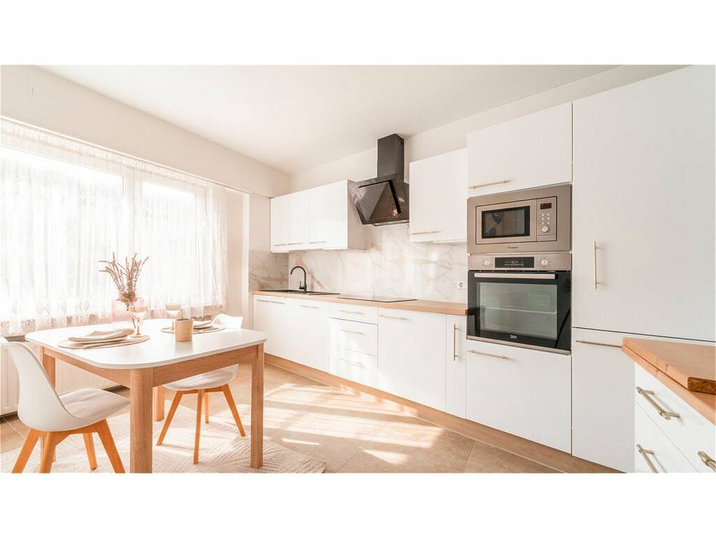 Hall d'entrée lumineux de ±4,5m² Spacieux salon/séjour très lumineux : ±33 m² Grande cuisine séparée et équipée : ±13 m² Débarras : ± 3m²